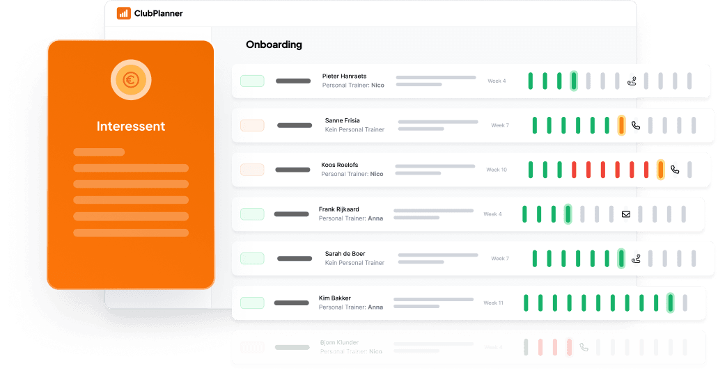Sieh auf einen Blick, wie neue Mitglieder ihre ersten 12 Wochen durchlaufen und greife schnell ein, um frühzeitige Abgänge und Umsatzverluste zu vermeiden.