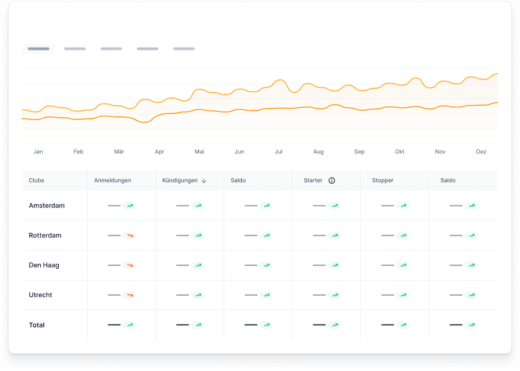 Mit den nationalen Benchmarks siehst Du, wie Dein Club abschneidet. Ideal für Franchisepartner oder Manager, die mehrere Standorte leiten. Sieh für alle Clubs in einem Dashboard, wo Verbesserungen nötig sind.